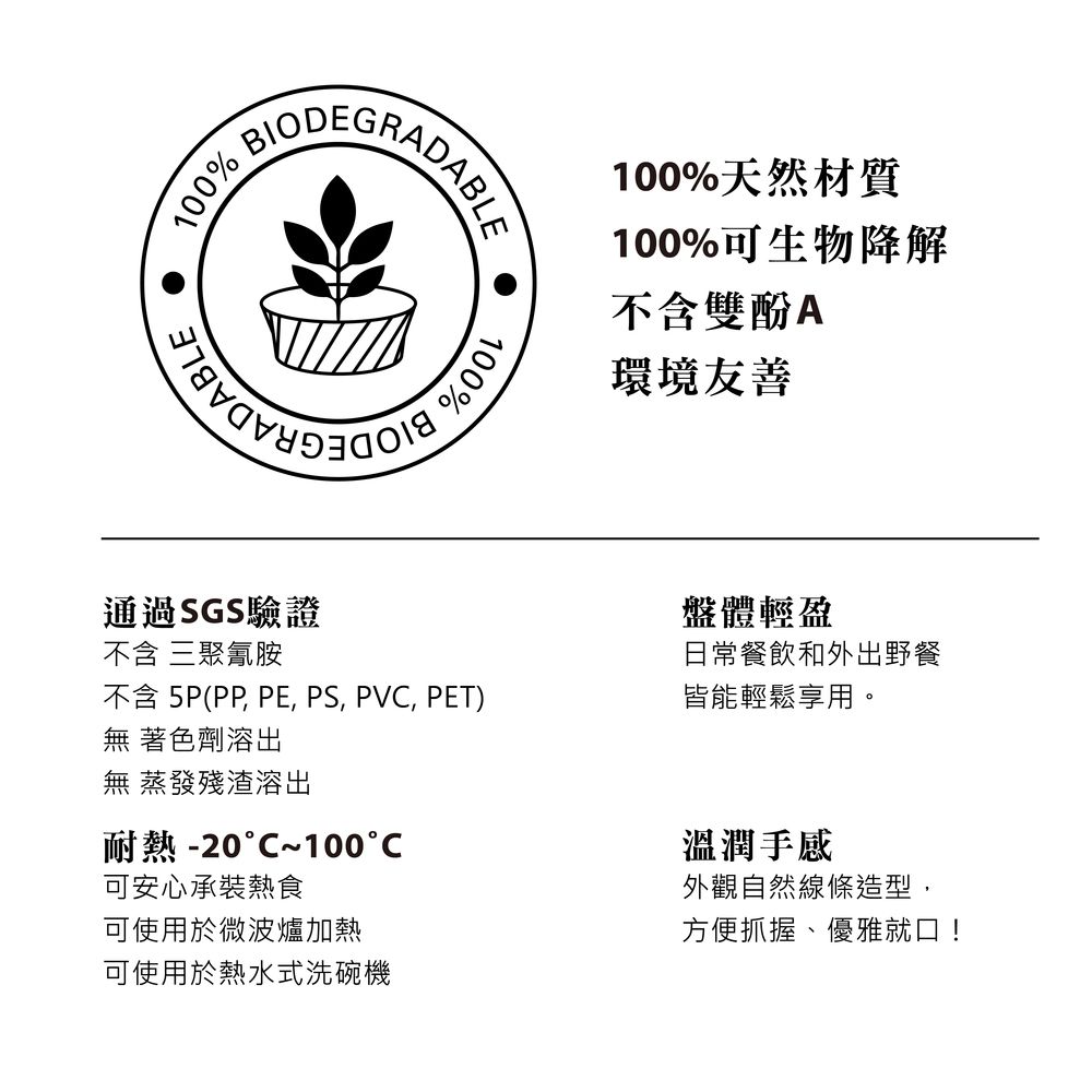 100%自然分解的竹纖維材質加上美麗的光紋造型與咖啡渣混色,讓日常餐食與戶外野食都能享受使用安心、友善地球、攜帶便利並且富有台式生活美學的完美餐具。![]()