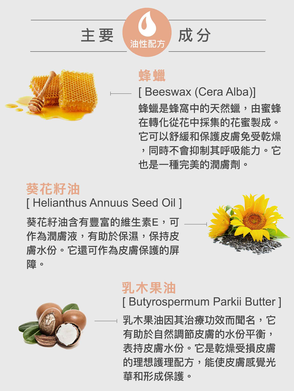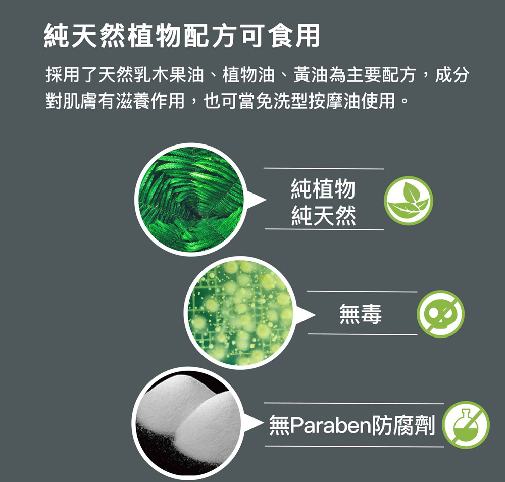 採用天然乳木果油、植物油、黃油為主要配方,不僅滋養肌膚,也可當免洗型按摩油。成分純天然、純植物可食用,無毒、無Paraben防腐劑、無甘油、無矽、不含化學/人工配方。![]()