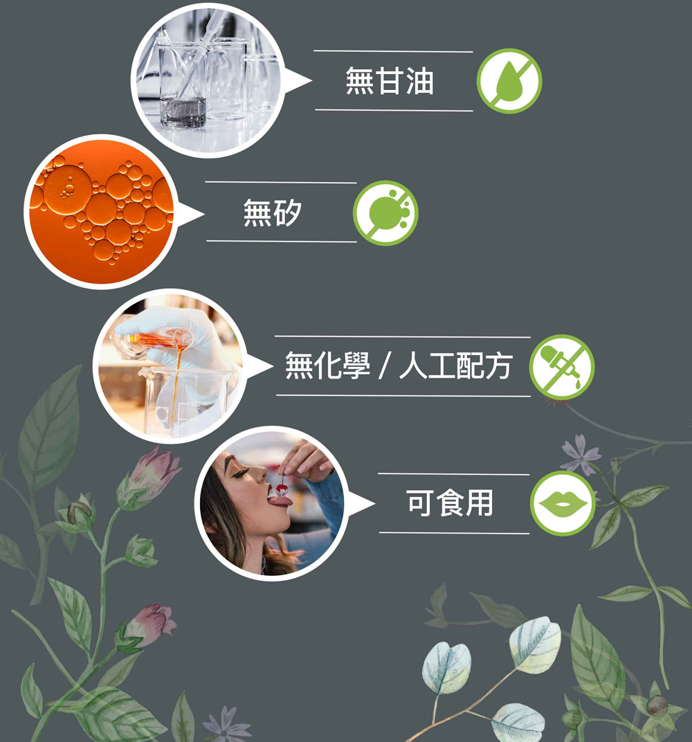 成分純天然、純植物可食用,無毒、無Paraben防腐劑、無甘油、無矽、不含化學/人工配方。