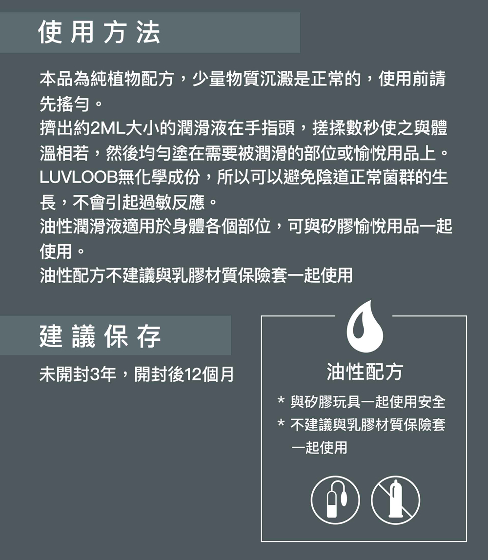 用法:本品為純植物配方,少量物質沉澱是正常的,使用前請先搖勻,取適量塗抹於需要滋潤之處。可與矽膠玩具一起使用。