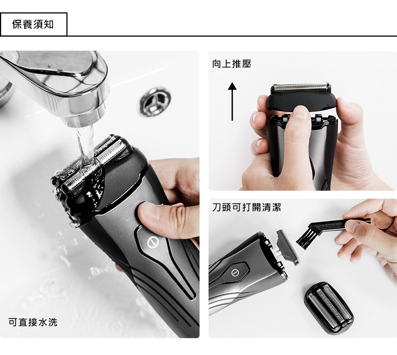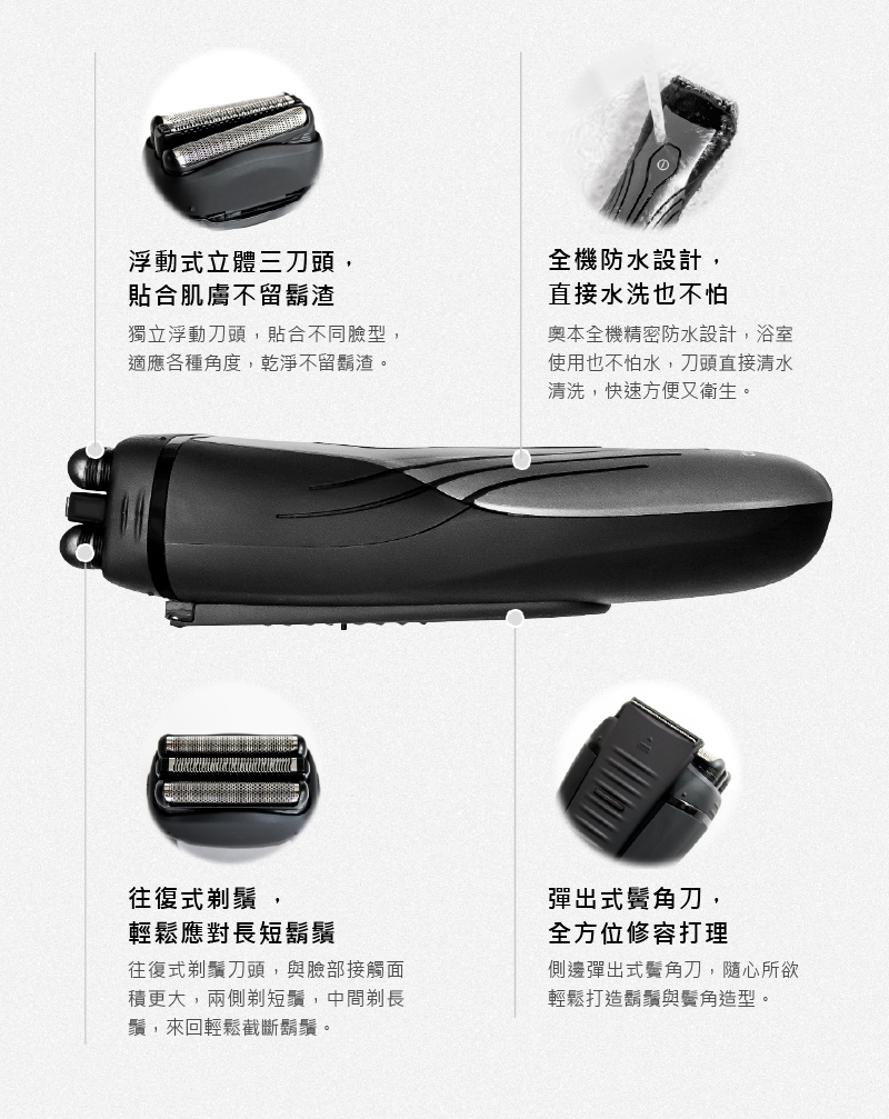 · 浮動式立體三刀頭,貼合肌膚不留鬍渣