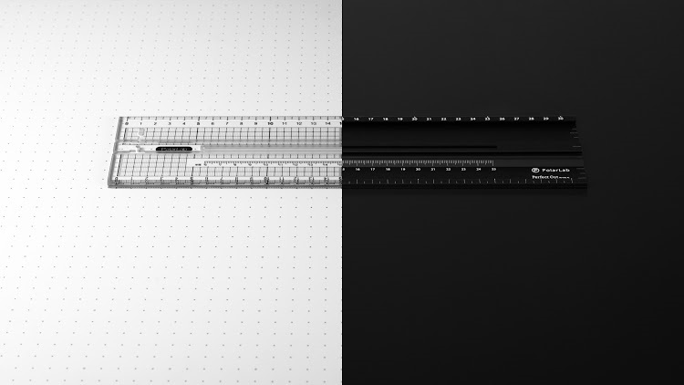 另以 CNC 加工一體成型的特殊溝槽,使三用切割尺與自由角度模組和圓規刀得以完美配合。尺的邊緣並嵌入不鏽鋼條增加耐用性。各種精心設計的細節讓特製「RU-301 三用切割尺 」容易上手、耐用,造型極簡又不失細緻。