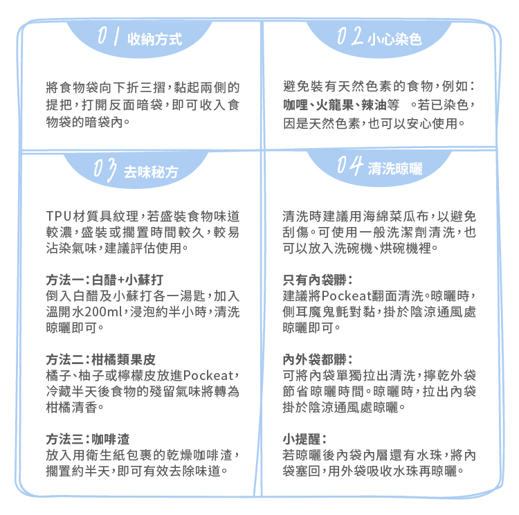 吃個湯麵,幾滴湯汁落在桌上或者噴到衣服上,都是在所難免,雖然捨不得它美美的外袋沾染到半點油星,但如果真的弄髒了,洗洗就好囉~ Pockeat食物袋本來就是取代塑膠袋當作袋裝食器,要是太過小心翼翼捨不得用,反而就不是好日子團隊的設計它的初衷了。