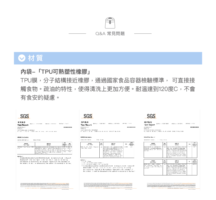 內袋的部分材質使用TPU,手感像是帶點彈性的厚質薄膜,無塑化劑,燃燒氣味不刺激也無毒性,耐熱度為 120℃,被認為是相對成熟的環保材質。
