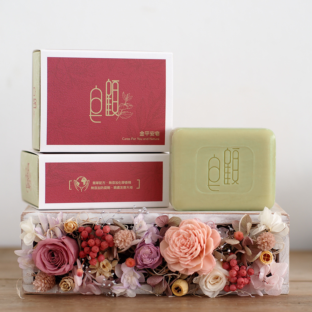 了解「金堅糠皂」的樸實之後,大約也不難猜想「金平安皂」的含義。民間傳說艾草、抹草、芙蓉和香茅能開運避邪,當然除了民間信仰的成分之外,這些植物本身就具有淨化作用,用於皮膚能消炎殺菌、活化調養肌膚恢復平衡。德國洋甘菊萃取和金盞花能舒緩肌膚狀況,甜杏仁油、荷荷芭油和乳木果油則提升滋潤度。