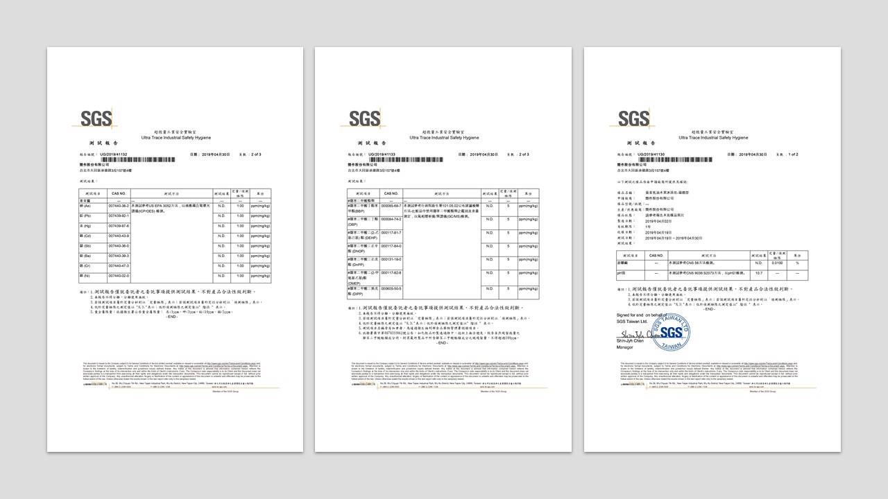 通過SGS檢測:七大塑化劑、八大重金屬、游離鹼-&-PH值