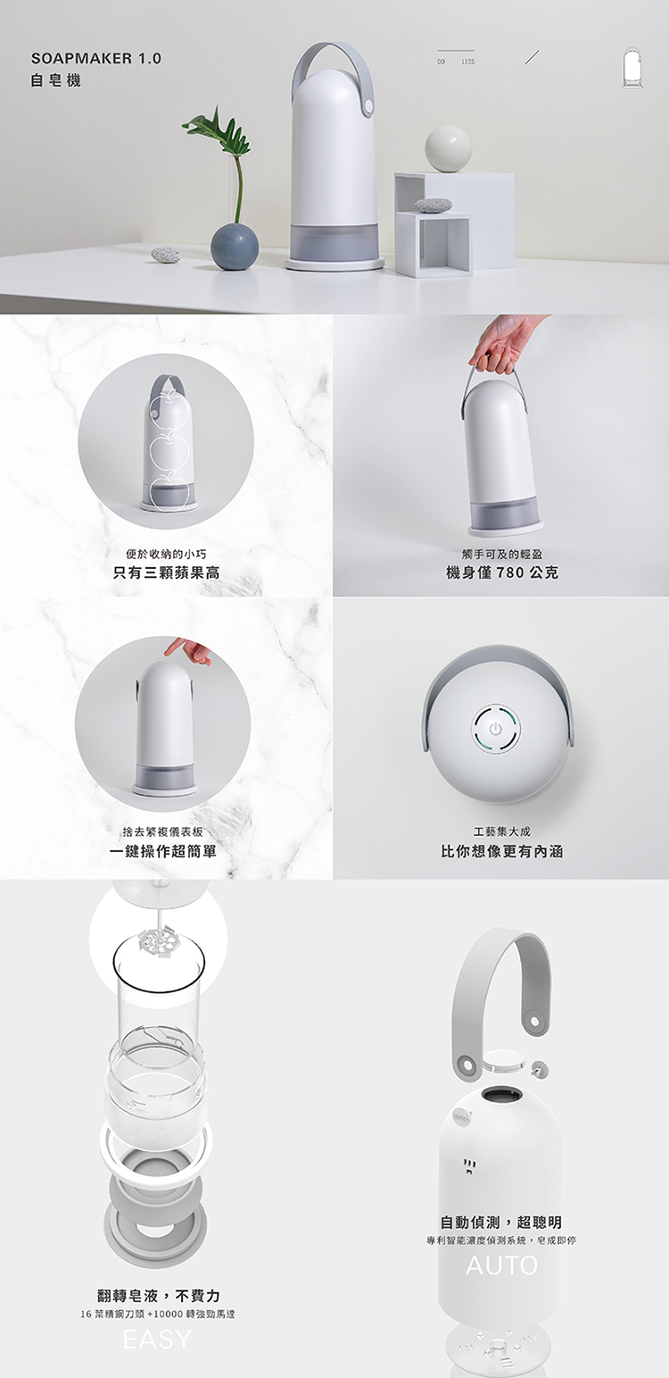 LESSDO 簡作發表世界第一台家用自皂機,只需要 10 分鐘、1 個按鍵就能完成個人化肥皂製作,更提供 54 種配方組合,幾乎涵蓋所有消費者的需求,不必像傳統手工皂耗費一小時以上和二十多項複雜過程。日前在集資平台嘖嘖搶先上線,不到 26 分鐘就達到集資目標,集資金額一天左右就突破百萬!