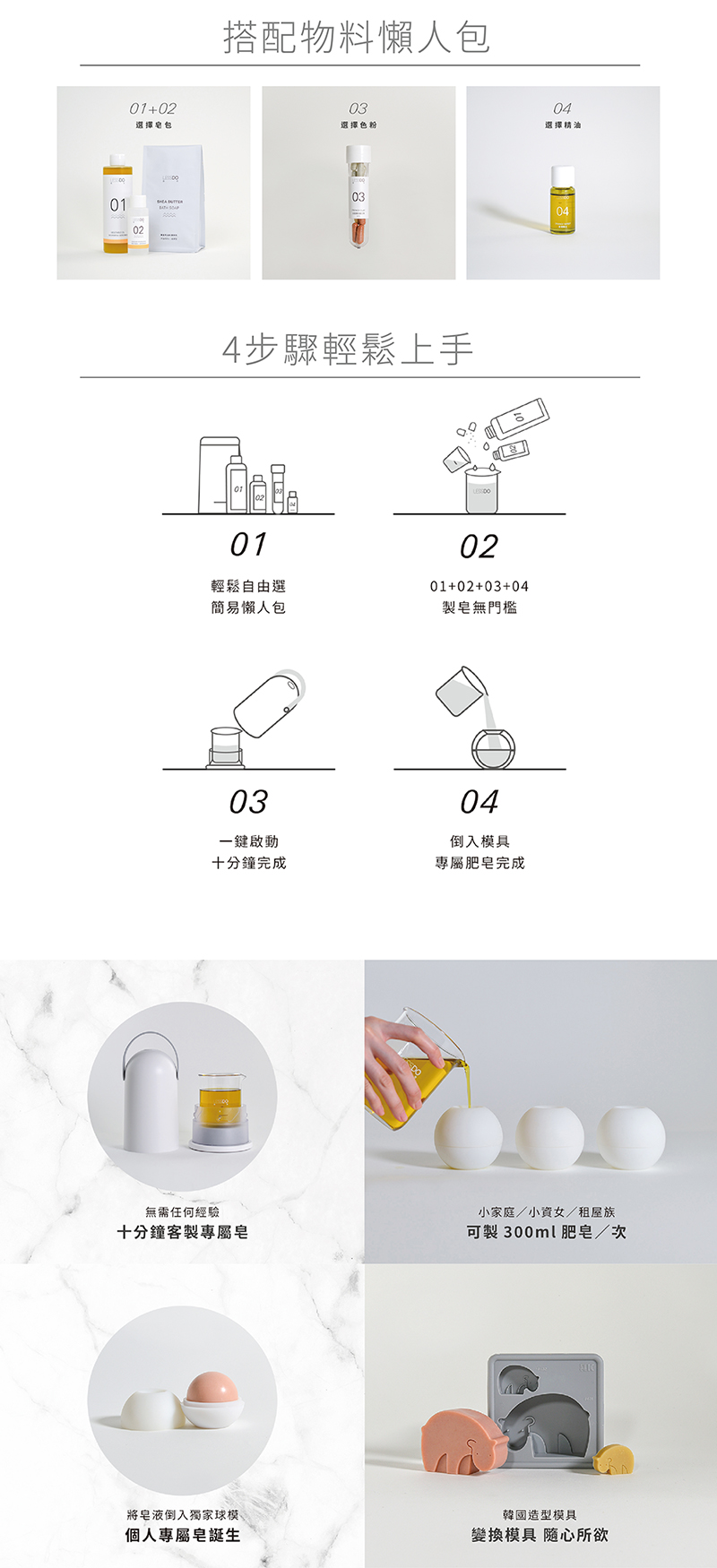 LESSDO 簡作團隊表示只需要選擇喜歡的步驟包,總共不會花超過 10 分鐘就能完成。步驟包包含:「01+02 皂包」有滋潤、清爽、溫和三種配方,「03 礦泥粉」有澳洲、法國兩種,「04 精油」也有三種選擇,可以搭配出 54 種組合。