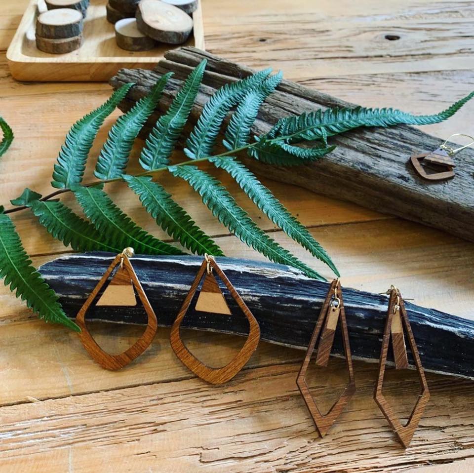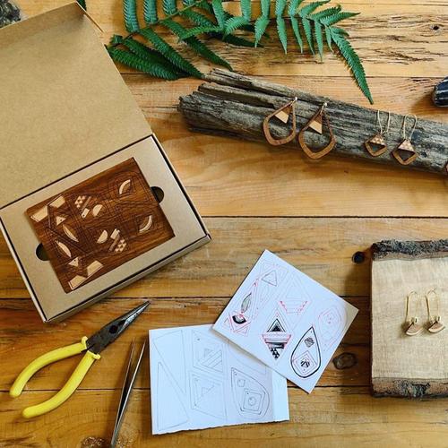 木片裁切成,各種形狀框、木塊,經過打磨、拼湊成喜好的樣式,可以是精緻小巧貼耳款,或是落落大方垂吊款,簡單樸質木色,經過拼拼湊湊堆疊,變成豐富層次的木頭耳飾