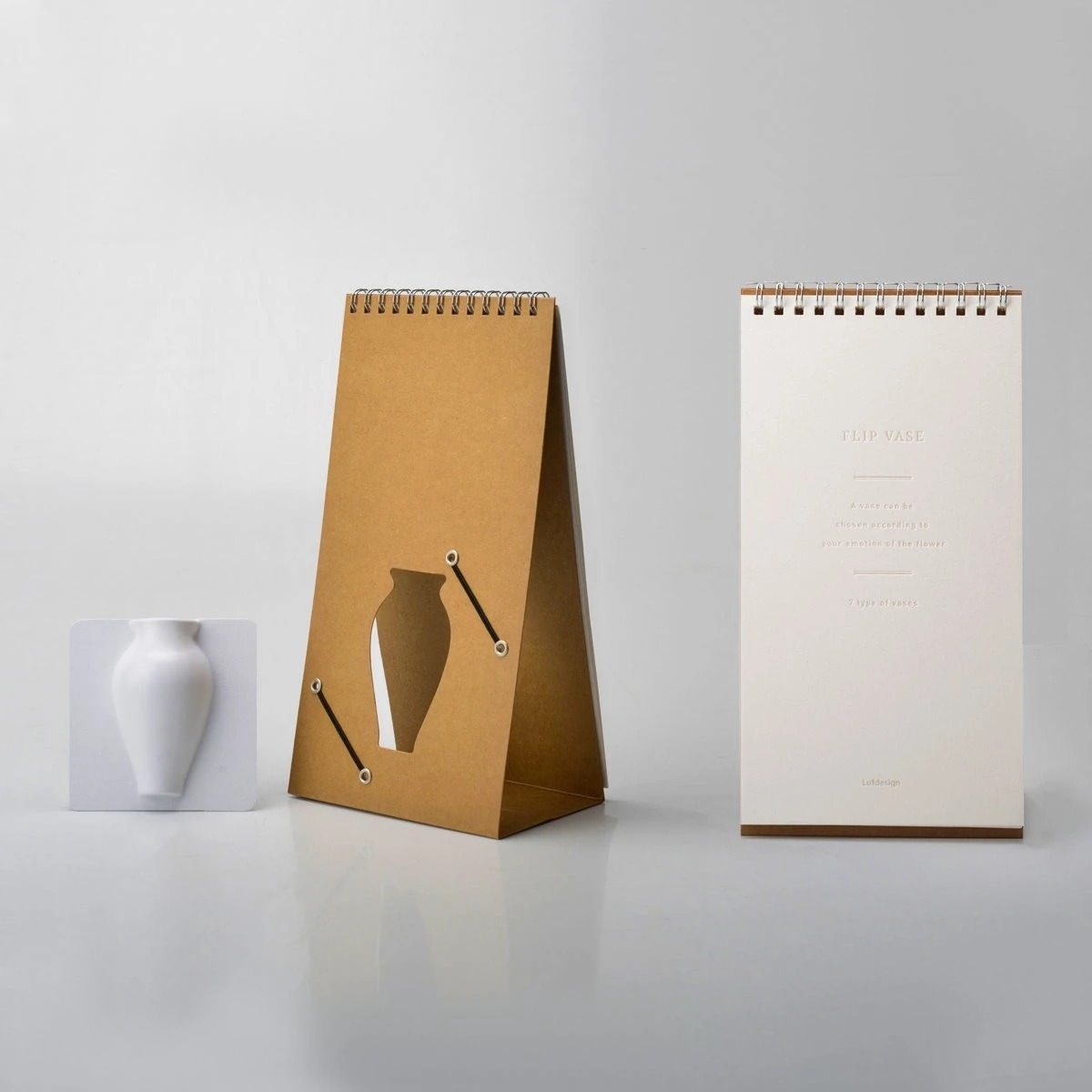 翻頁花器是設計團隊突破框架,結合翻頁書和花瓶的作品,外觀看起來就像是一本桌曆,一頁一頁有著優雅的花瓶或人物插畫,但它卻有著一個能夠固定於翻頁書的花瓶,使用者可以將花朵插進這瓶容器中,再以心情翻動印有圖騰的書頁,搭配出不一樣的花花世界。