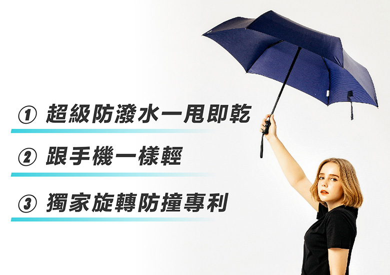開傘只要輕鬆按壓開傘鍵,而收傘我們擁有獨家專利的緩衝裝置 AntiBlaster,最輕的收傘力讓男性,女性,老人小孩都能使用。