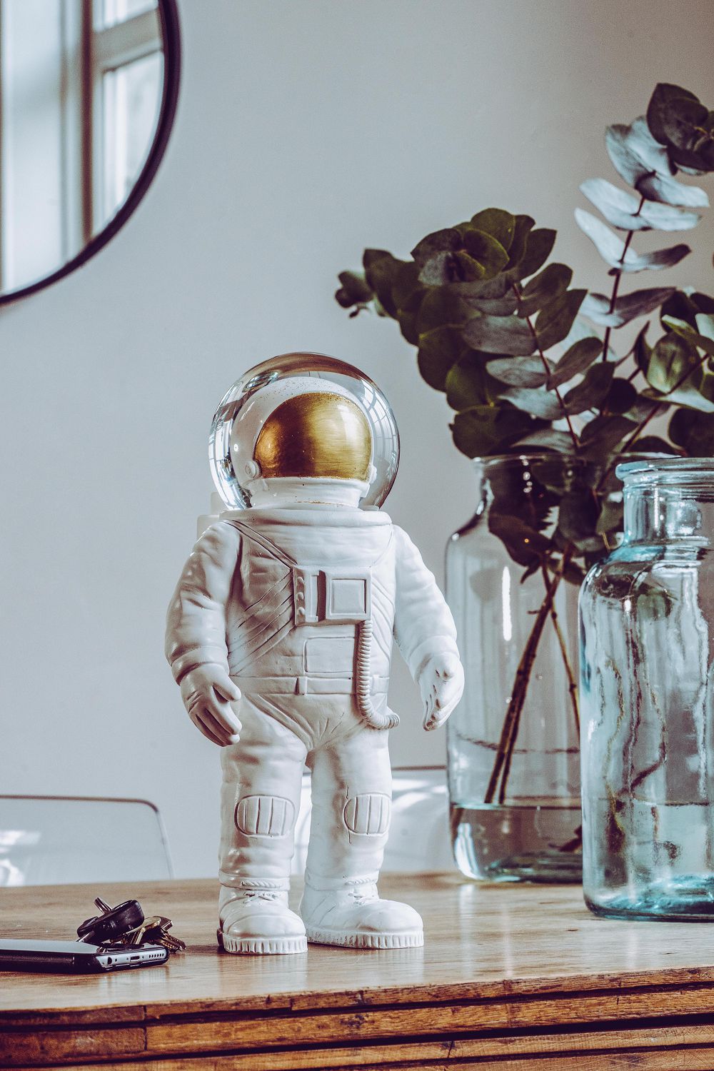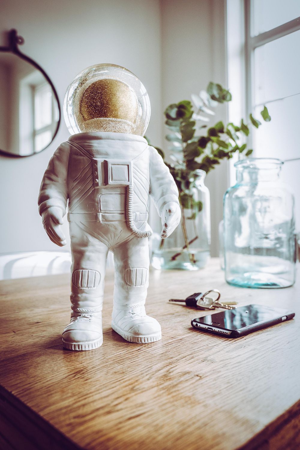◆ 精緻的金色閃光片在猩猩太空人充滿水的頭盔裡,只需搖晃,效果極佳