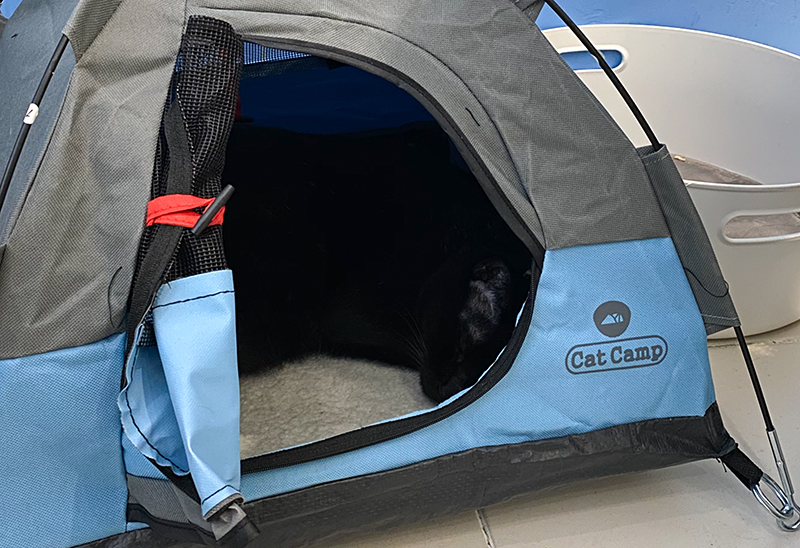 尺寸經過測試實驗,九公斤胖貓(就是上面那隻黑的)也能進得去,同理若是小型狗狗,也可以用Cat Camp,在草地上跑累了可以有個躲太陽休憩的好地方~