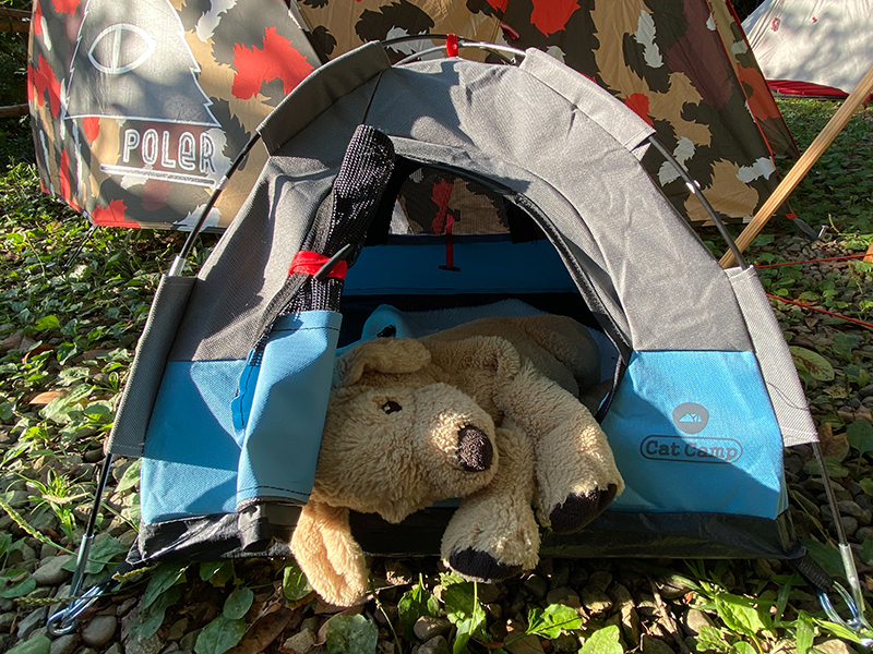 Cat Camp 的完全體長這樣,剛剛加上去的遮雨棚,會在門口上方形成一個可愛的小屋檐,雖然如果遇到真正的狂風暴雨應該也是頂不住(要是去露營還遇到暴雨也太倒霉了),但是一般基本的防雨能力應該不會有問題,頂多回家就跟自己的帳篷一起攤開來曬曬就是了XD