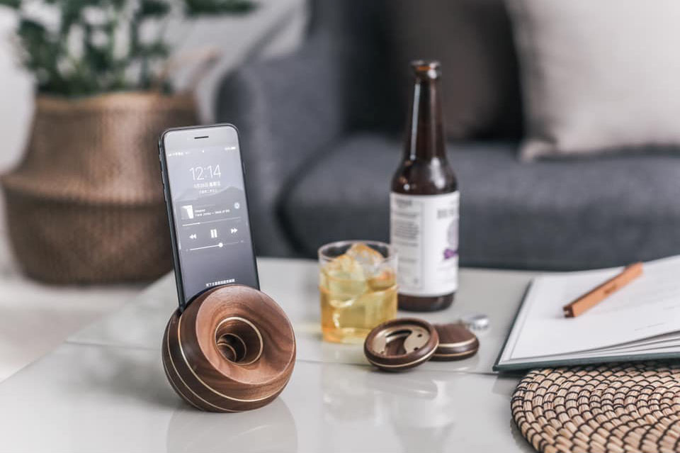 EcHome 為不插電擴音器,有別於一般市面上同性質的擴音器,運用銅與木結合的概念及外觀造型,使之放出的音樂失真率大大的下降許多聲音上也悅耳許多。