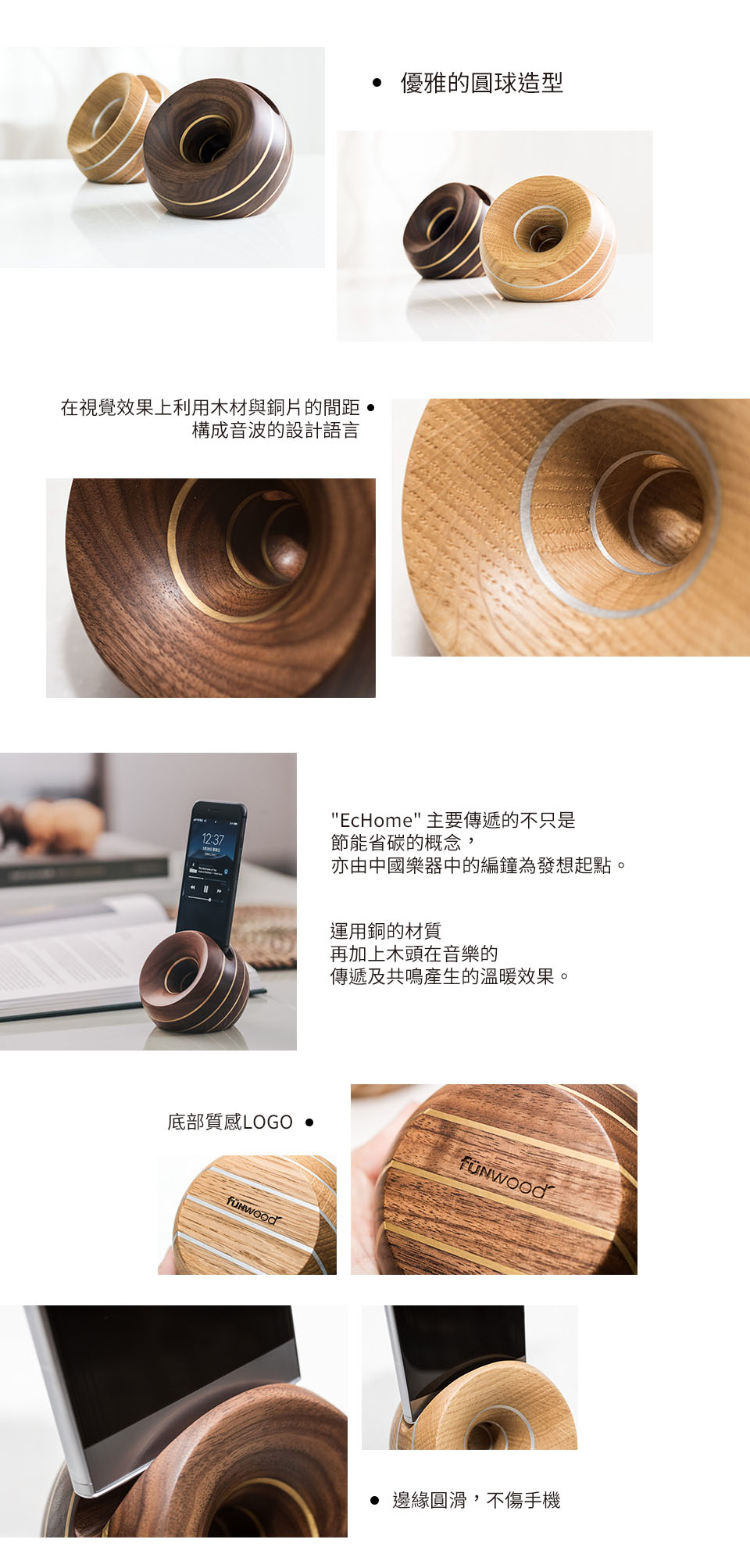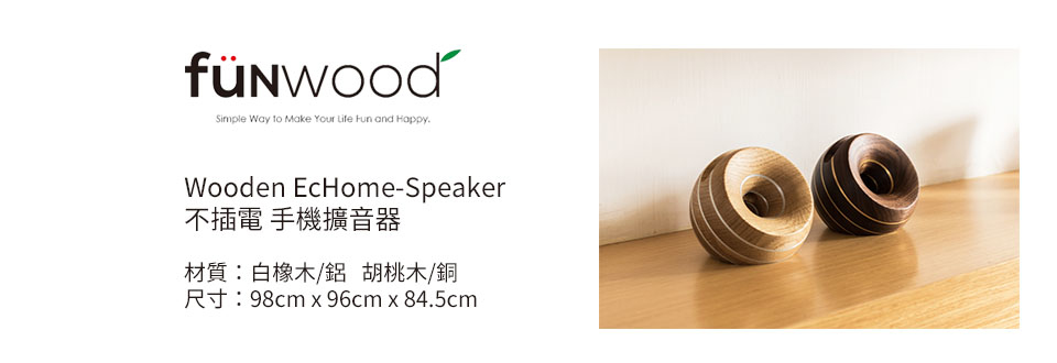 時下 3C 產品的蓬勃發展,藍芽喇叭和一般桌上型喇叭為家家必備的 3C 產品之一。funwood 此款擴音器,"EcHome" 主要傳遞的不只是節能省碳的概念,亦由中國樂器中的編鐘為發想起點 。"編鐘 " 是中國古代樂隊中的一種主奏樂器,中國是製造和使用樂鐘最早的國家。它用青銅鑄成,由大小不同的扁圓鐘按照音調高低的次序排列起來,懸掛在一個巨大的鐘架上,用丁字形的木錘和長形的棒分別敲打銅鐘,能發出不同的樂音,因為每個鐘的音調不同,按照音譜敲打,可以演奏出美妙的樂曲 , 每件鐘都能發出兩個不同音高的音,即隧音和鼓音(鼓左或右),這是中國古代編鐘的一個特點和優點。它可使編鐘的音域擴大,音階更為完整。為什麼編鐘會使用青銅來製作,為什麼市面上的樂器有很多都是運用銅的材質(薩克斯風、大小喇叭等),在加上木頭在音樂的傳遞及共鳴產生的溫暖等等效果,讓銅加木的概念就此展開,也創造了 "EcHome" 此項產品。