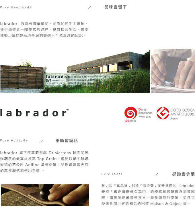 labrador思潮中,極簡主義是我們的設計理念。目前世界各地為了提高銷售,多以廉價且低品質材質生產,但相對的卻是犧牲了使用壽命、使用質量及品牌格調。故labrador賦予年輕有活力的設計師在不受限的獨立思考及自由發揮下創造出有吸引力的產品,並期許我們對公平消費及環境的愛,能創作出與消費者間更深層溝通的逸品。