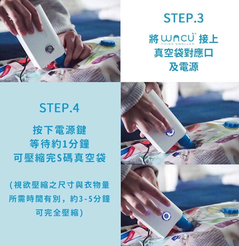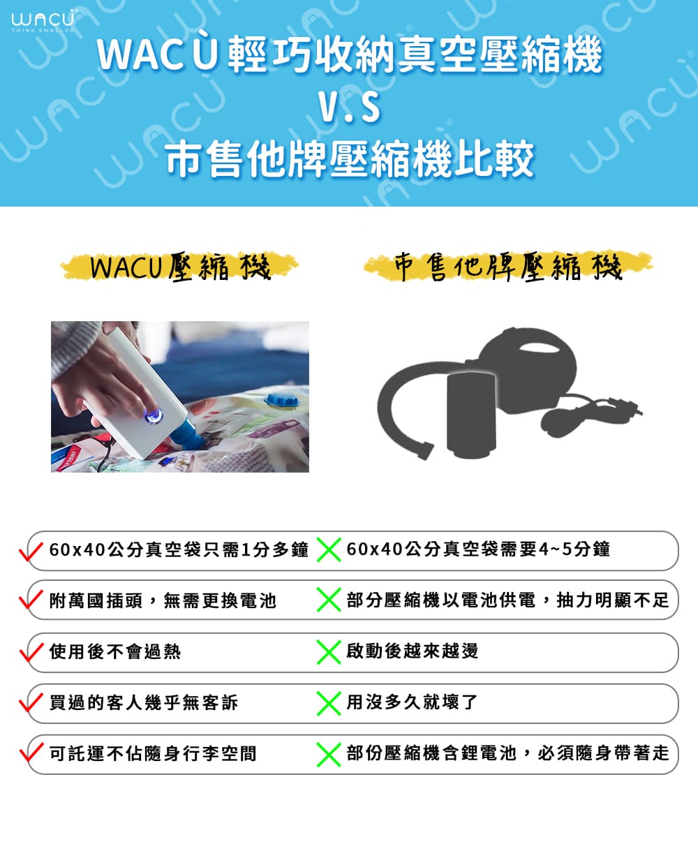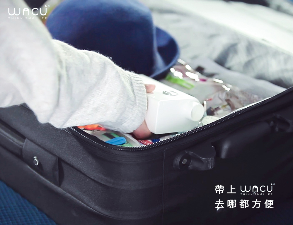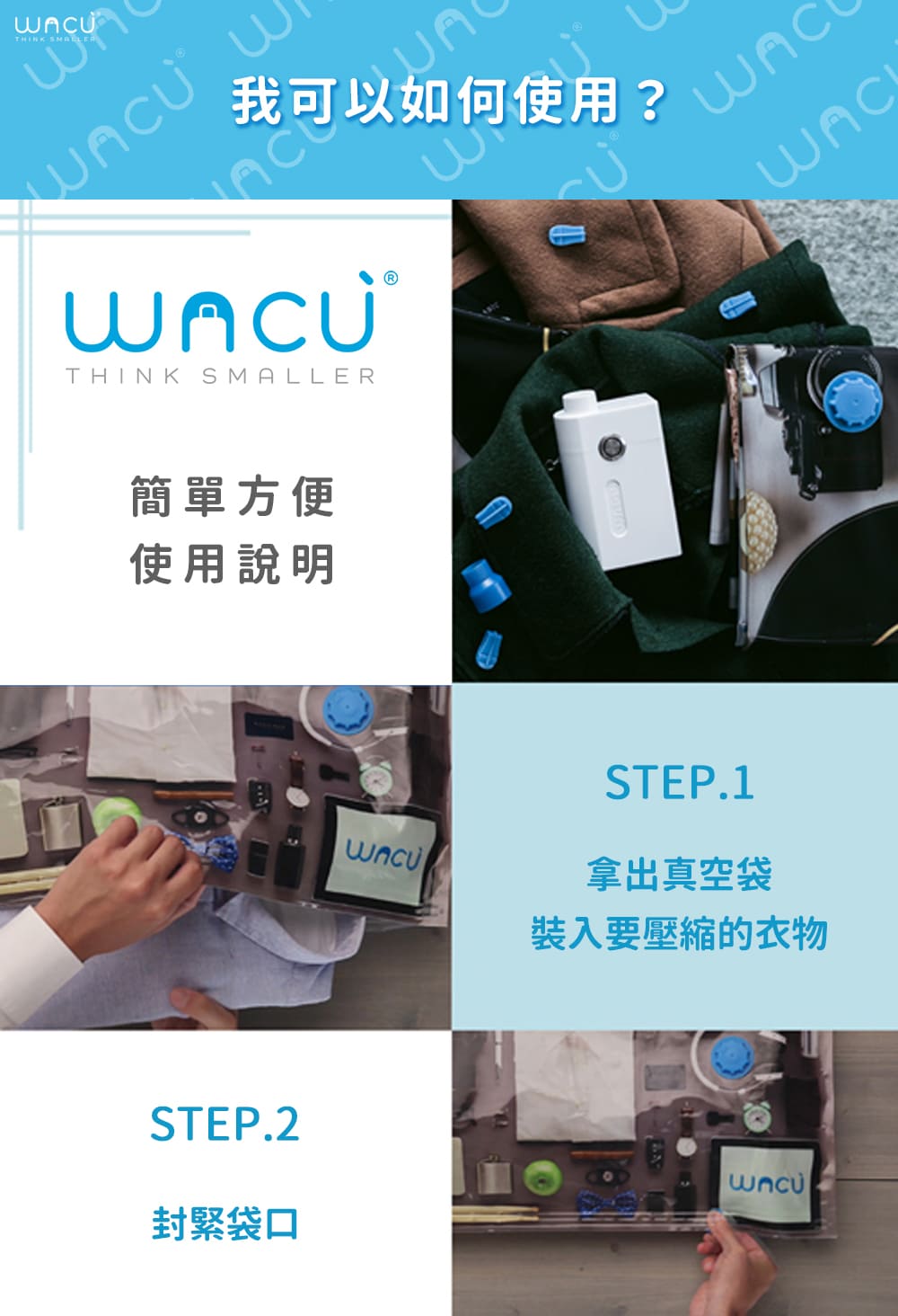 WACU 義大利輕巧收納真空壓縮機,輕巧的體積可壓縮物品、增加空間,如手掌般大小,方便又實用,功能強大又安全,可增加行李的利用空間、減少行李箱數量,使旅途一路舒適、愉快。WACU 擁有一個萬用插座,可幫助機器快速抽取真空袋中的空氣,壓縮體積並創造一個完美的空間,適用於任何旅途、居家收納,讓經常出差的商務人士到追求更多行李空間的旅者們,以及不忘帶著家人出遊的您,WACU 使您的行李永遠整齊俐落,不再為沒有行李空間而煩惱!