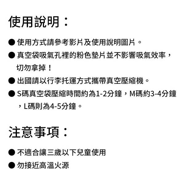 -真空袋:60 x 40 cm( S 碼 )/80 x 60 cm( M 碼 )/90 x 70 cm( L 碼 )材質:-真空壓縮機:ABS