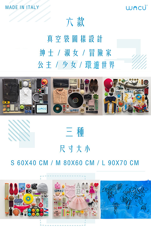 WACU 義大利輕巧收納真空壓縮機,輕巧的體積可壓縮物品、增加空間,如手掌般大小,方便又實用,功能強大又安全,可增加行李的利用空間、減少行李箱數量,使旅途一路舒適、愉快。WACU 擁有一個萬用插座,可幫助機器快速抽取真空袋中的空氣,壓縮體積並創造一個完美的空間,適用於任何旅途、居家收納,讓經常出差的商務人士到追求更多行李空間的旅者們,以及不忘帶著家人出遊的您,WACU 使您的行李永遠整齊俐落,不再為沒有行李空間而煩惱!