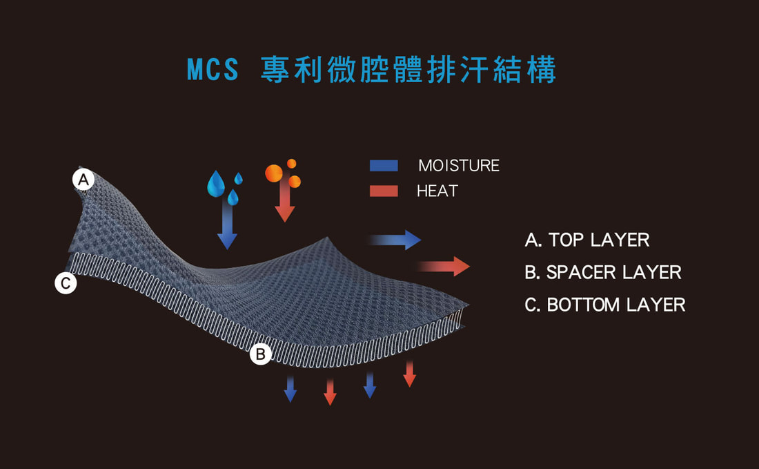 2. 採用 MCS 微腔體排濕系統,有數倍的透氣與排汗效果,更適合運動使用。