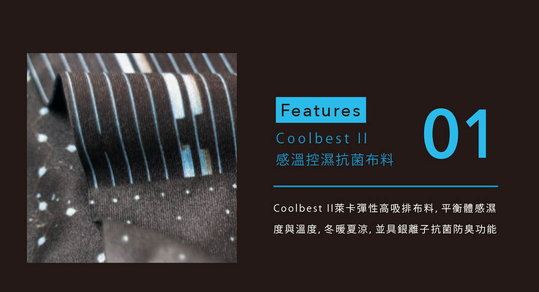 3. 採用 Coolbest II 控溫布料,冬暖夏涼,吸濕排汗,色澤更飽和細緻。