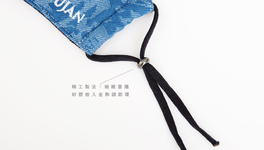 A:為了提升精品質感,我們將金屬拋光電鍍,再以超精細雷雕APUJAN的logo (仔細看,一邊中文,一邊英文喔!)。同時為了使用上的手感與便利性,再於金屬環內嵌入內埋式矽膠套環。「外金屬,內矽膠」,不但在調整耳帶的過程中順暢無比,單看亦如同金飾精品般,襯托著口罩的不凡魅力。