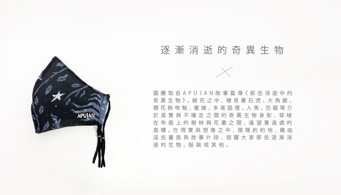 圖騰取自APUJAN 2019春夏系列「那些消逝中的奇異生物」。緹花織中,棲息著石虎、大角鹿、櫻花鉤吻溝、蜜蜂、多尾狐狸、人魚等介於真實與不確定之間的奇異生物身影,穿梭在布面上的樹林與花叢之間,展開一段奇幻章節。