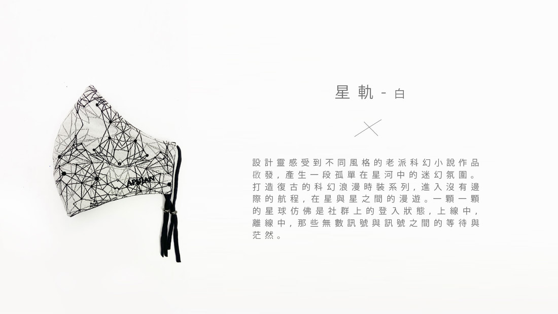兼具奇幻色彩與抗霾效用擅長藉由服裝作為媒介,訴說一篇篇奇幻時尚故事的APUJAN,本次與淨對流Xpure的聯名合作可說是集結品牌歷年精采篇章所發表的針織緹花布料,從科幻浪漫的星軌、致敬推理作品的偵探遊戲、逐漸消逝的奇異生物,到述說時間流轉的夏夜夢境,每款風格奇幻又文雅,也為重新定義防霾口罩美學樣貌。