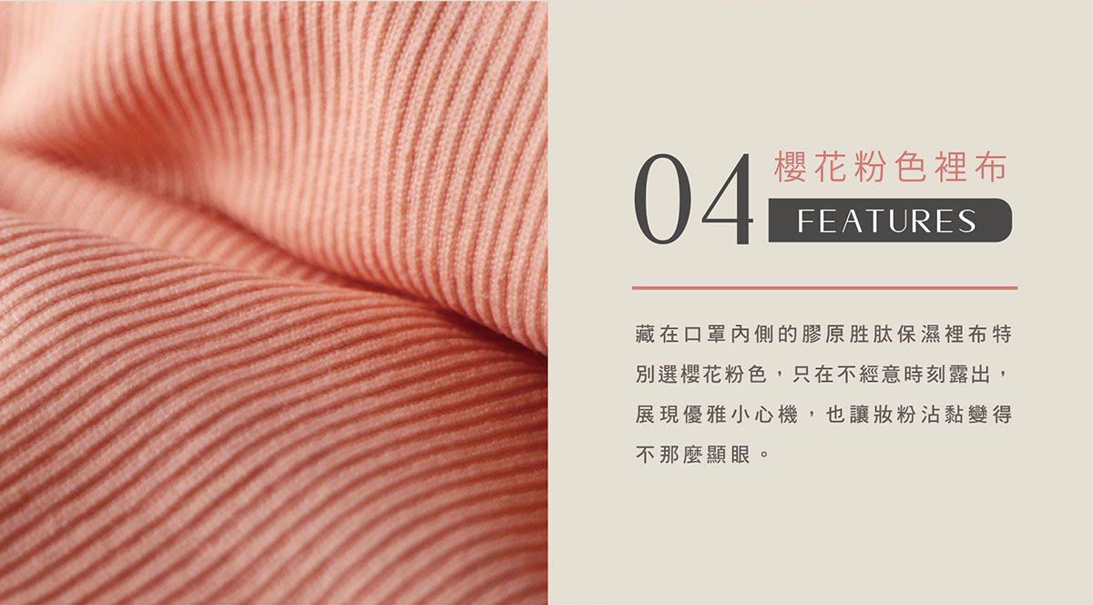 2. 使用膠原胜肽櫻花粉裡布,具有親膚保濕的功效,並能抗菌防臭、抗 UV