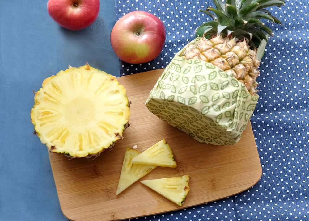 還有切半的鳯梨或是南瓜也適用,折成袋狀包裏麵包,貝果等,終結塑膠袋的旅行。蜂蠟基本款(XL)