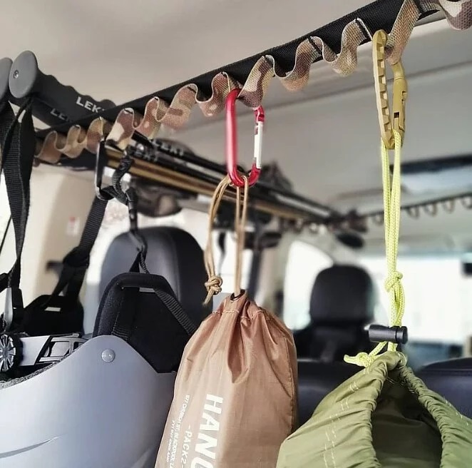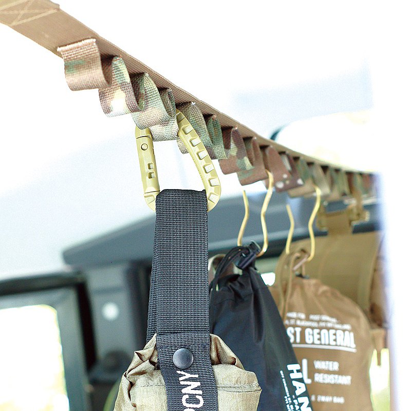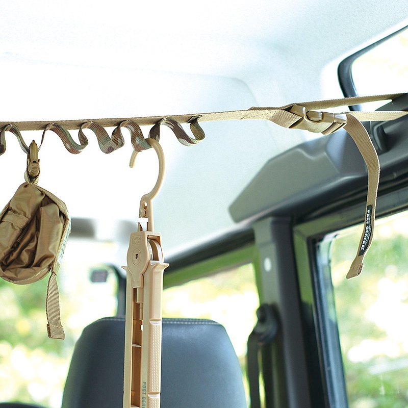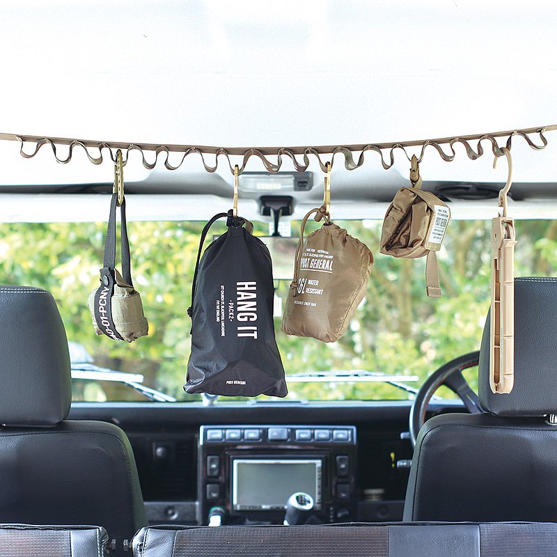 露營在外最怕找不到空間掛燈飾,為此能夠在車內、樹上懸掛的吊帶,只要有安全扶手或是支撐點就可以輕易安裝。吊帶可調節長度,從家中、小型轎車到SUV格式車型都能使用。