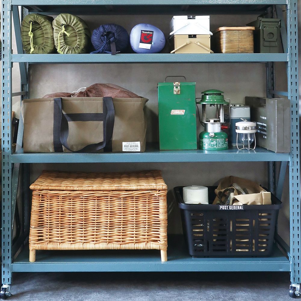 體驗戶外生活氛圍,塑膠、尼龍固然方便亦保養,仍須自然系的材質中和都會感,落地式藤編收納籃上印有 Post General 字樣,用法與造型皆展現了復古感,居家室內使用時可作為放置綠意植物或雜誌書報,而置於外出情境時則因立式設計可保持底面乾淨,清爽又具實用性。