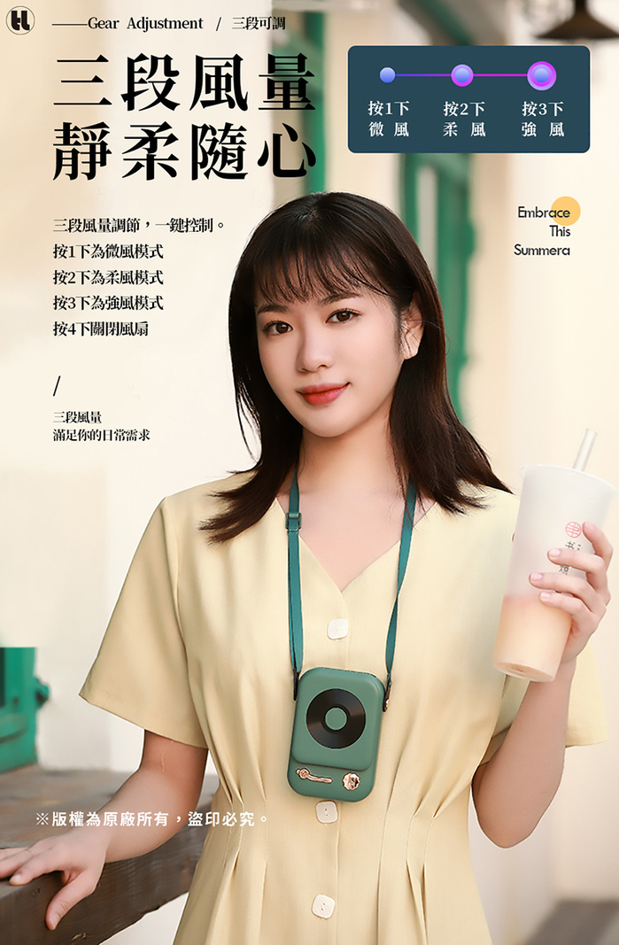 1. 按下開關一下為微風模式,連按兩下為柔風模式,三下為強風模式。2. 充飽電約 3 小時。3. 續航力: 2~10小時不等(依照不同風量模式)注意事項