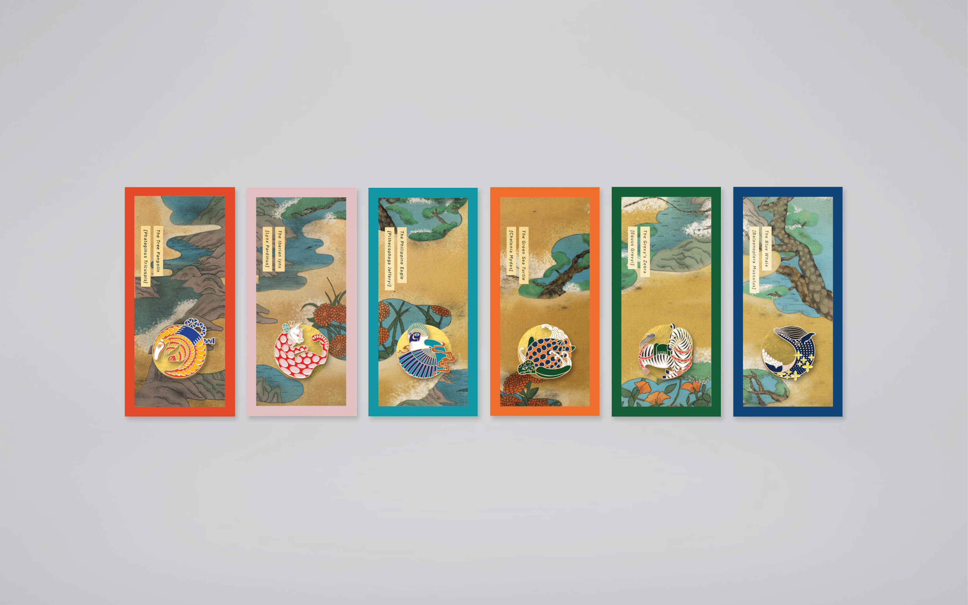 之所以選用《山海經》作為美術藍本,是因其記述了古代地理、物產、神話、巫術、宗教等方面的內容,其中包括75種奇異怪獸,有些學者將其視為神話,或是遠古地理的探勘紀錄,可說是富於神話傳說最古老的地理書。不過要如何創造出神話版的瀕危動物姿態? llab design擷取古籍中珍奇異獸自由奔放線條,將這6種陸海空動物輪廓簡化成圓形,交錯使用寶藍色、正紅色、亮黃色、深綠色等顏色,視覺上看起來鮮豔又不失神話感,而近似瓷器質感的擺飾,放在水墨風格背板上,收在透明塑膠盒中,讓其宛如縮小版古畫,極度搶眼。