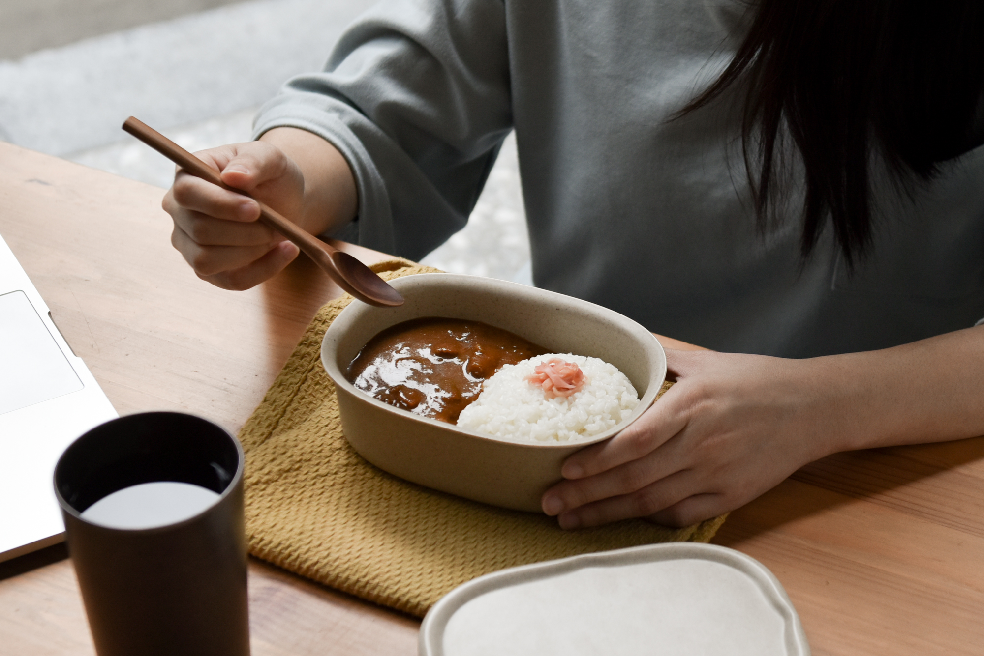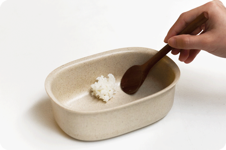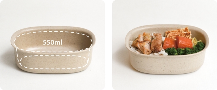 Rice-Cycle 稻殼便當盒有著簡約溫潤的設計,550ml 的圓潤器型份量適中,加上稻殼材質的溫暖手感, 500g 的重量拿握在手裡,手感、質感十足。