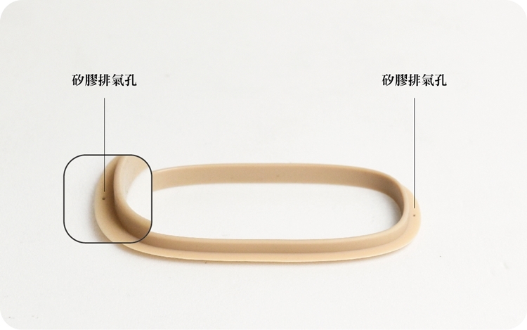 盒蓋另有矽膠圈配件,矽膠圈上的排熱氣孔協助熱氣釋放、緊密蓋上,攜帶便當不用擔心湯汁美食輕易漏出。