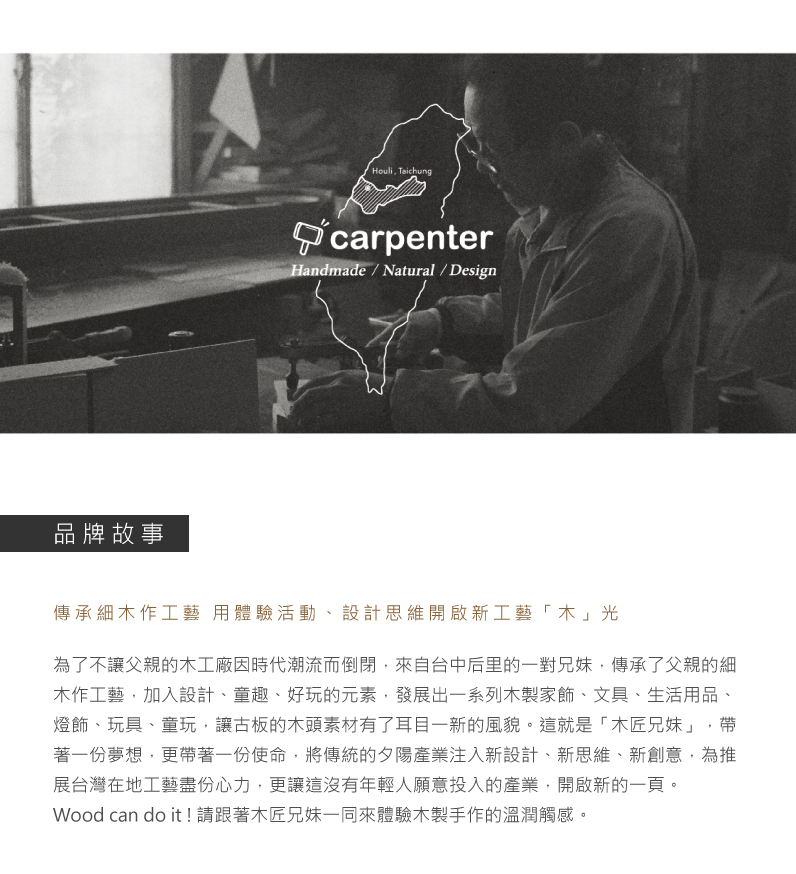 木匠兄妹 | 品牌故事為了不讓父親的木工廠因時代潮流而倒閉,來自台中后里的一對兄妹,傳承了父親26年的細木作工藝,加入設計、童趣、好玩的元素,發展出一系列木製家飾、文具、生活用品、燈飾、玩具、童玩,讓古板的木頭素材有了耳目一新的風貌,這就是「木匠兄妹」。帶著一份夢想,更帶著一份使命,將傳統的夕陽產業注入新設計、新思維、新創意,為推展台灣在地工藝盡份心力,更讓這沒有年輕人願意投入的產業,開啟新的一頁。Wood can do it!! 跟著木匠兄妹一起品木、玩木、愛木!一同來體驗木製手作的溫潤觸感。