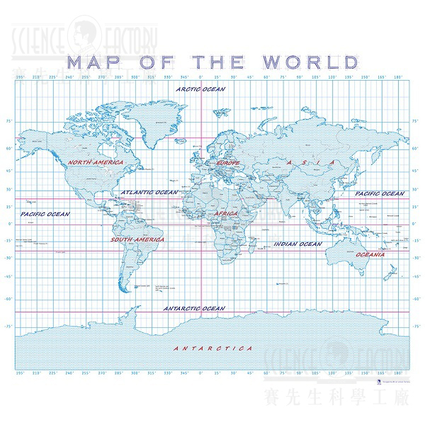 賽先生獨家設計,世界地圖浴簾登場!細膩的描圖紙版本地圖設計,精細的展現經緯線及國家名稱等資料。此為麥卡托投影地圖,藍色的格子網紋細線依實際經緯線繪製,頂部和底部會稍微失真變形;桃紅線分別代表了南北極圈、南北回歸線及赤道。