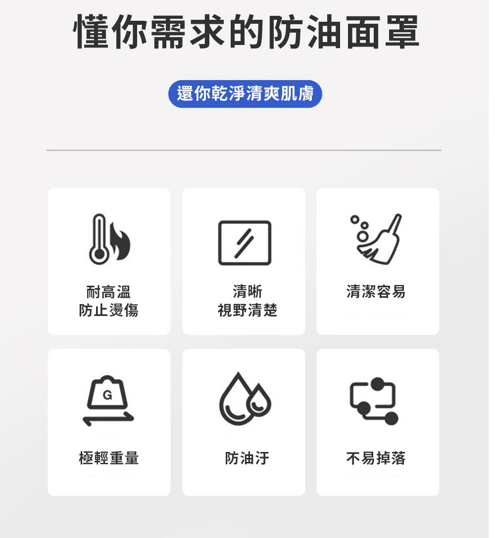 1. 有效阻擋飛沫、油汙、灰塵等。