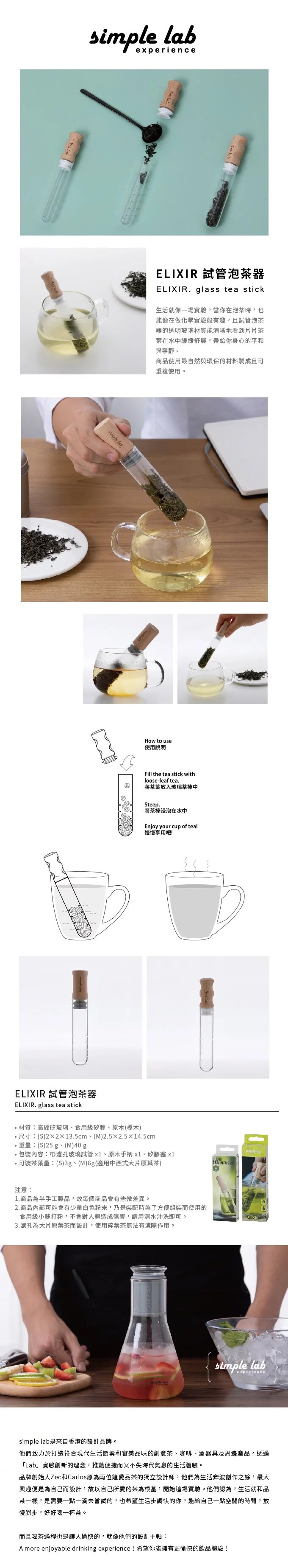 尺寸:-2 × 2 × 13.5 cm(S款)/2.5 × 2.5 × 14.5 cm(M款)材質:-高硼矽玻璃、食用級矽膠、原木(櫸木)規格:-品名:ELIXIR 試管泡茶器
