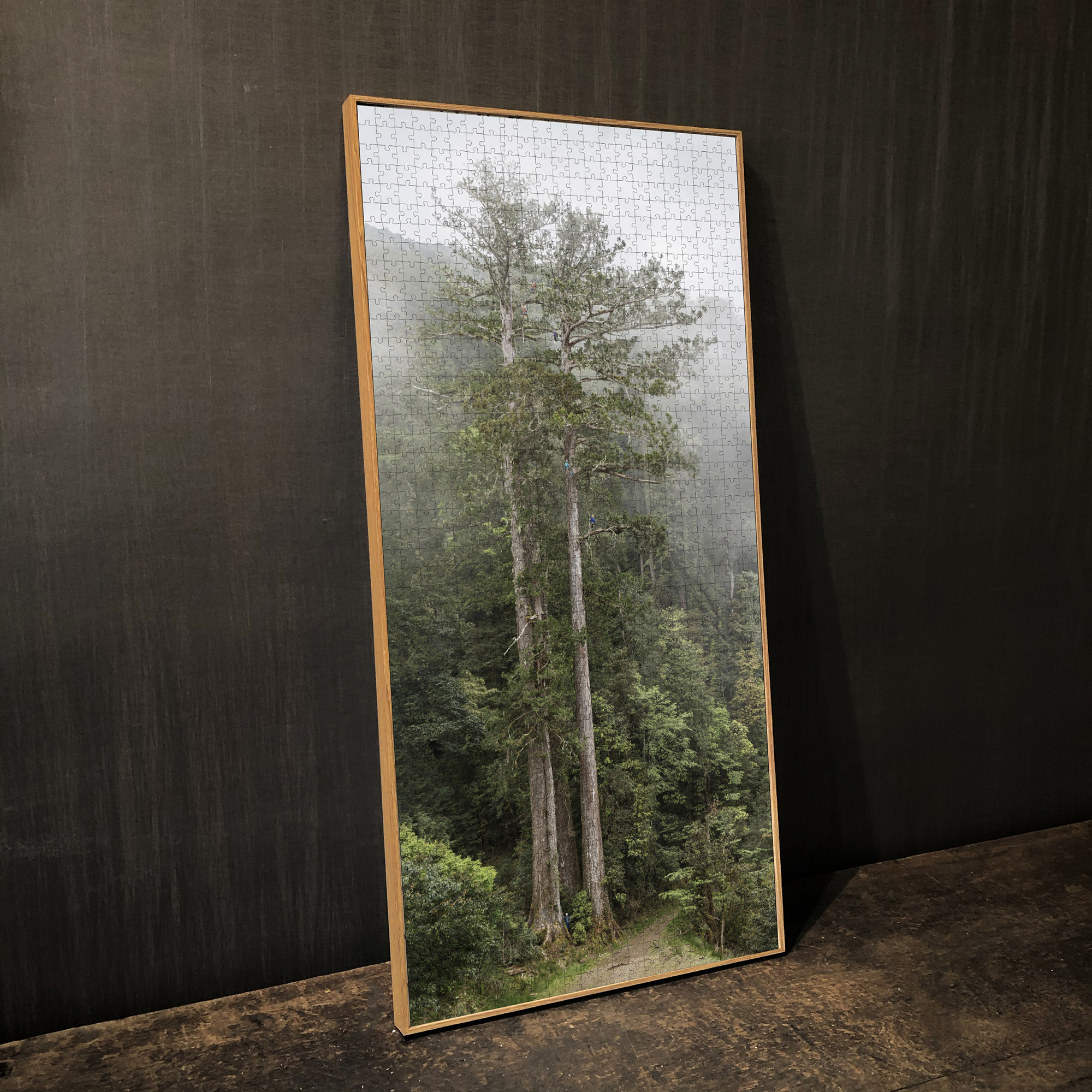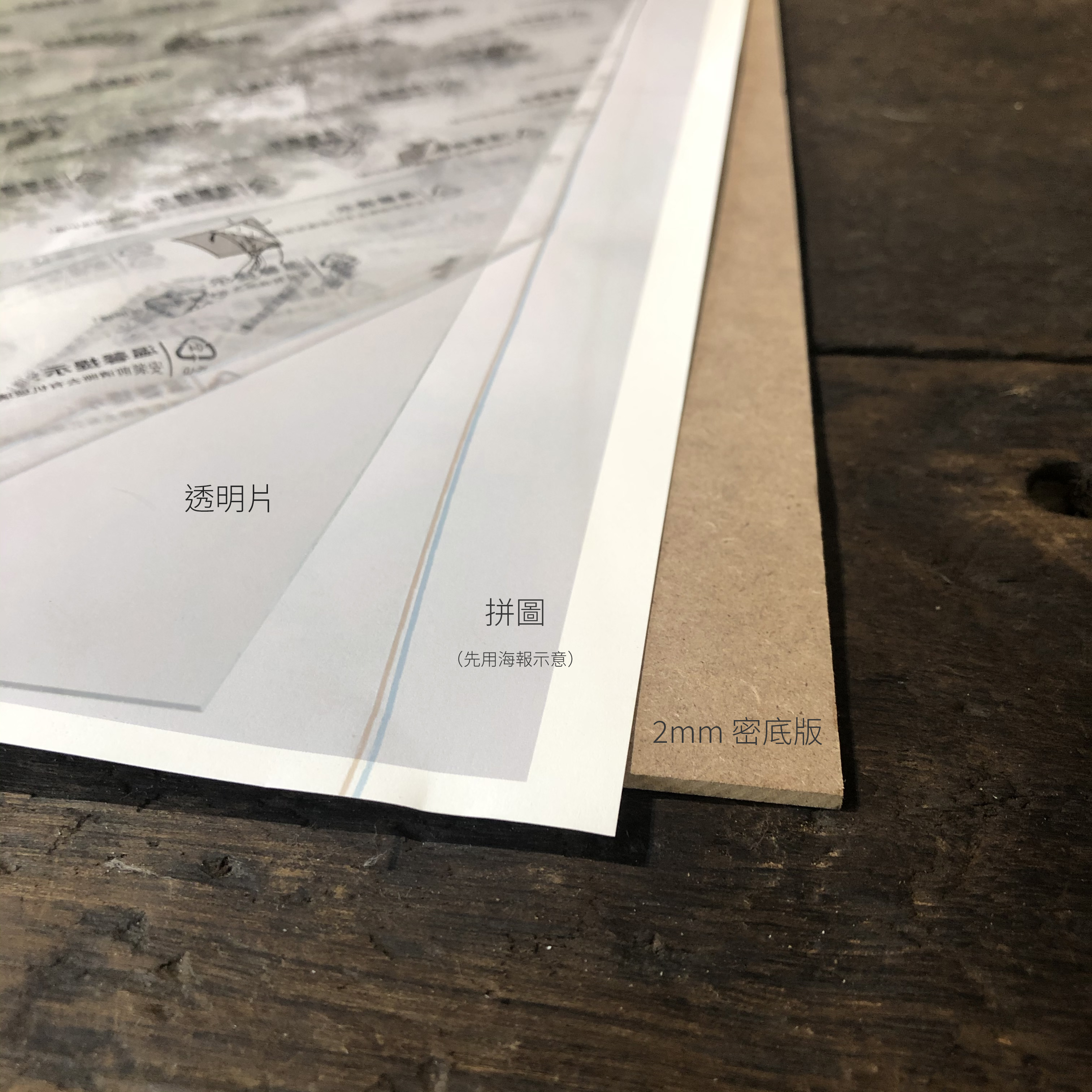 將拼好的拼圖放在 透明片、密底版之間夾好,拼圖可不上膠。如前面不放透明片(減少反光)拼圖則須在正面上膠。