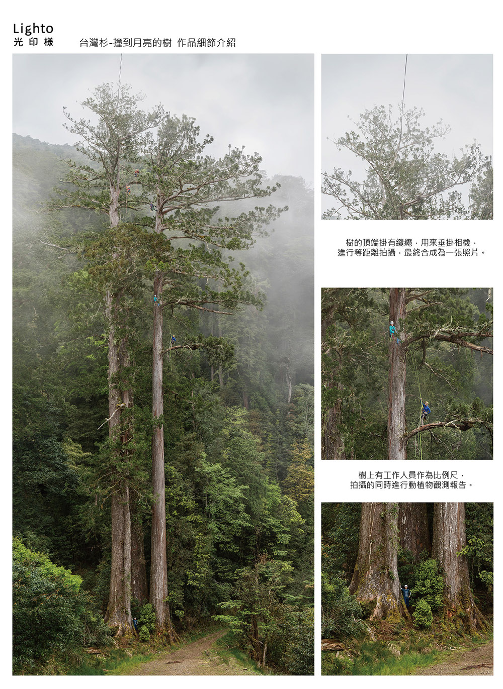 「台灣杉在地球上存在超過億年,因此有活化石的稱號,屬名「 Taiwania 」,更是全球唯一以「台灣」作為「屬名」的植物,在棲蘭山區,台灣杉的樹量並不多,呈零星分布。台灣杉是東亞最高的樹種之一,魯凱族以「撞到月亮的樹」稱呼它,只有極少數人得以完整觀看它的樣貌。」台灣杉是植物學界,唯一以台灣當屬名的植物,深具全球知名度與重要性,1904 年日本學者首次在海拔 2000 公尺的南投山區,採集到台灣杉標本。它主要分布在海拔 1800 到 2500 公尺的雲霧帶山區,是冰河孑遺植物,世界級的活化石,由於台灣杉經常與紅檜混生,在大伐木時期,部分族群同時遭到大量砍伐。「台灣杉等身照片拍攝計畫」團隊是來自澳洲塔斯馬尼亞省的珍妮芙山納博士(Dr.Jennifer Sanger)和史蒂芬皮爾斯(Steven Pearce)夫婦,前者為附生植物研究學者,後者則為專業攝影師。拍攝團隊 12 日於農委會林試所發表演講,作為在台拍攝行程的結尾。這是他們全球的第三個拍攝計畫,70 公尺高逐公尺拍攝的台灣杉照片,將組裝成一張照片,呈現台灣杉的面容,大約一個月後完成。為樹木拍攝等身照片的濫觴,可溯及 2009 年國家地理雜誌拍攝在美國的全球最高樹種──紅杉;「 Tree-Project 」則是後繼之秀,類似計畫仍屬少數。促成這項計畫的林業試驗所研究人員徐嘉君說,一般人拍攝較高的樹木時,都得由下往上拍,比例也跟著改變。等身照片則以軌道沿著樹身升降拍攝每個高度,每張照片都以一比一的比例拍攝,不會扭曲、變形。「台灣宜蘭縣棲蘭山區一七○線林道十公裡處,有3棵比鄰而生的巨大台灣杉「三姊妹」。澳洲團隊來台和台灣愛樹人協力拍攝等身照,拍攝結果令人震撼,也讓澳洲攝影師直呼「 台灣人實在應該因為擁有這片森林感到驕傲 」。」 — 正見新聞網撞到月亮的樹拍攝故事:http://e-info.org.tw/node/204865![]()