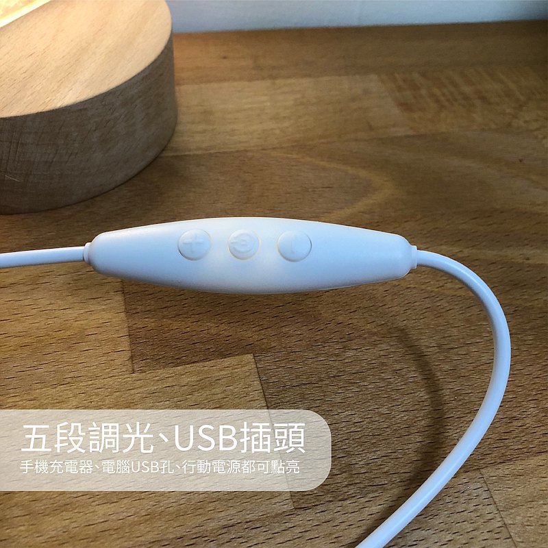 原木底座,USB插頭、暖黃光LED、五段強弱光線調節。