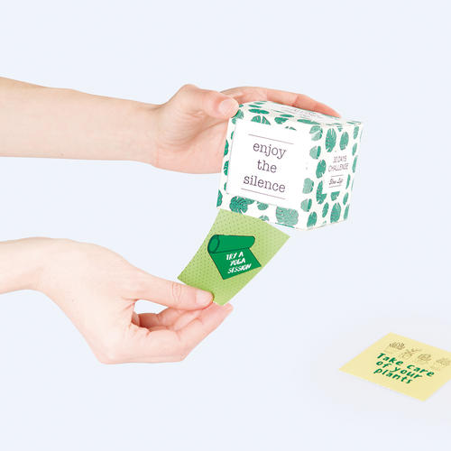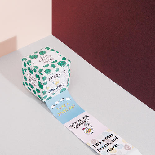 這個 30 天挑戰被設計成一個抽拉式的可撕清單(概念有點像公共廁所的捲筒式衛生紙 XD),每張小卡片之間都有虛線,拉到盒面下方的鋸齒部位撕下完成的主題,就可以挑戰下一個。用一個月的時間,完成卡片上的內容,就像撕日曆一樣,撕完一盒,你的人生就過去一個月了,欸不是!是完成一項成就感十足的挑戰啦~